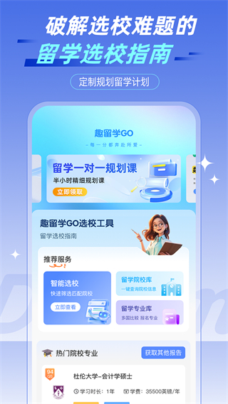 趣留学GO是专为怀揣留学梦想的用户量身打造的一站式留学服务工具,集定制规划、院校查询、课程精选、资讯速递于一体,精准对接留学全流程需求,从个性化规划方案制定到院校信息精准检索,从优质课程筛选到留学动态实时推送,全方位助力用户高效推进申请事宜,避开申请误区,精准锁定梦想学府,让留学申请之路更顺畅、更具方向感。