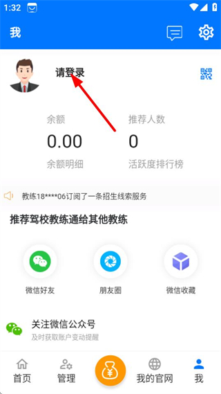 1、在驾校教练通首页,点击底部导航栏的我选项,可进入个人中心页面。