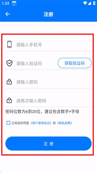 4、在注册页面,填写信息,勾选协议后点击注册即可完成账号注册。