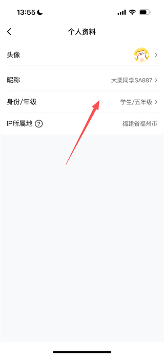 3、在个人资料页面,点击身份年级选项,进入身份和年级选择页面。