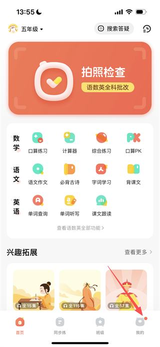 1、在作业帮口算首页,点击底部导航栏的我的选项,进入个人中心页面。