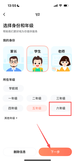 4、在选择页面选定身份与目标年级后,点击下一步完成更改设置。