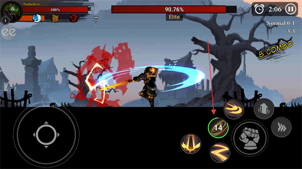 4、积累连击触发8COMBO,释放技能持续输出,削减精英敌人血量。