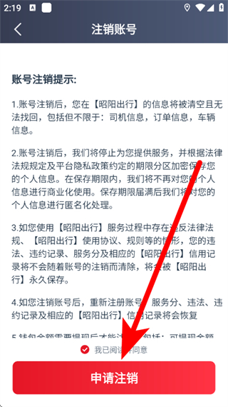 5、在申请注销页面,勾选后,点击申请注销,完成账号注销。