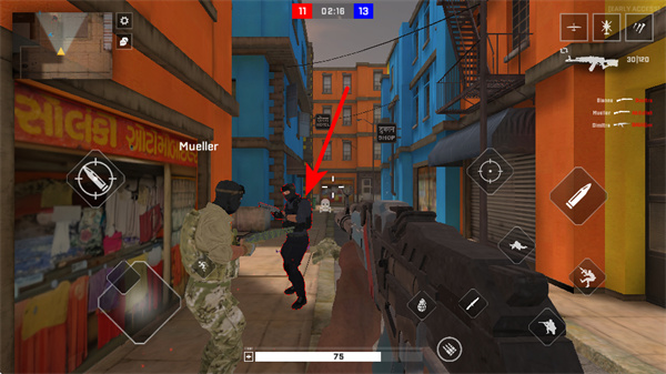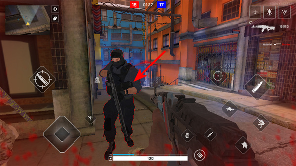 1、瞄准红色箭头指向的敌方目标射击,这是击败敌人、积累击杀数的核心操作,需精准瞄准敌方位置。
