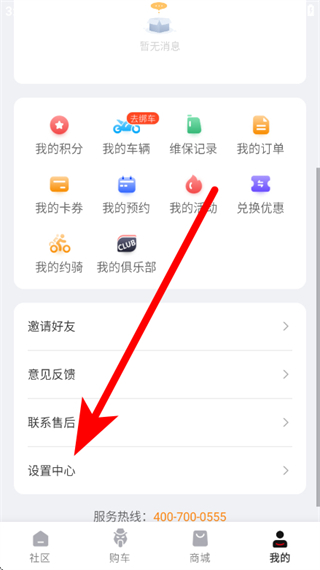 2、在我的页面,点击选择设置中心,进入设置中心页面。
