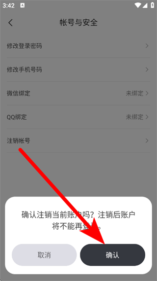 5、在弹出的确认提示,点击确认,完成账号注销操作。