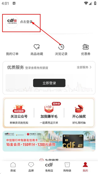 1、在中免海南商城首页,点击底部我的,进入个人中心页面。