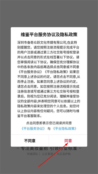 1、在维鉴的服务协议及隐私政策弹窗中,点击同意,进入首页。