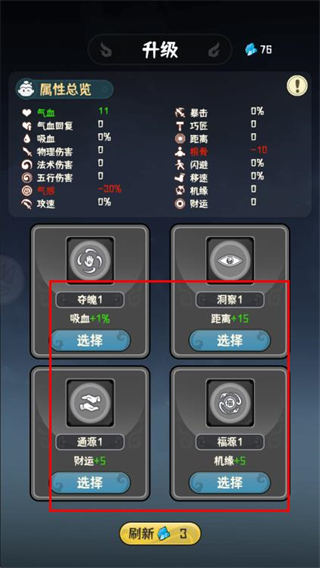 战斗采用虚拟摇杆操控,兼顾操作的灵活性,升级时可选择属性技能,操作手感与属性成长深度绑定,既需要玩家通过操作躲避危险,也需要策略选择技能来强化战力。