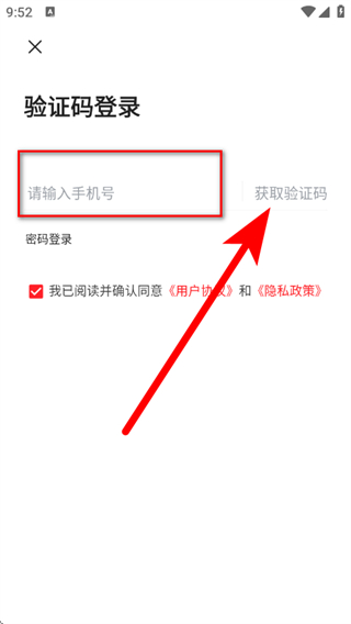 3、在验证码登录页面,输入手机号,确认已勾选协议后,点击获取验证码。