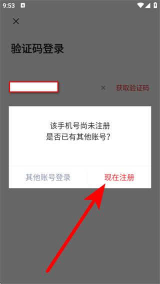 4、在弹出的该手机号尚未注册提示框中,点击现在注册。