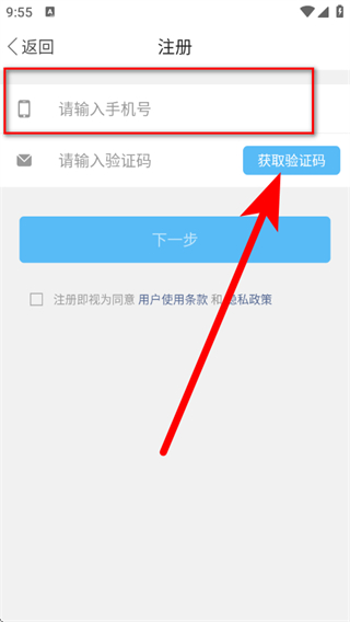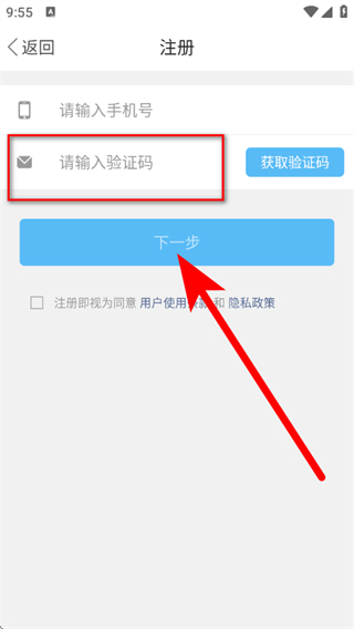 5、填写收到的验证码,勾选用户协议后,点击下一步,完成注册。