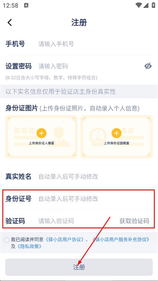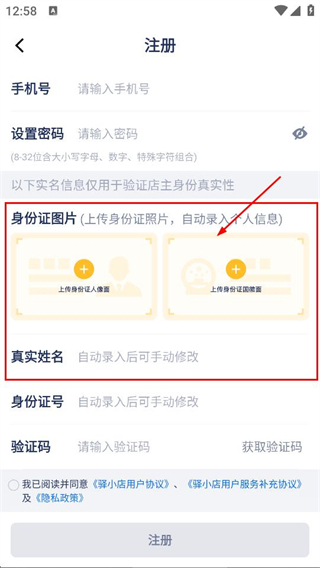 3、在注册页面,上传身份证人像面和国徽面图片,自动录入真实姓名。