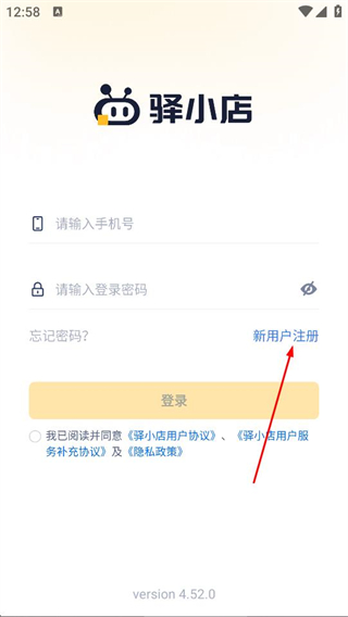 1、在驿小店登录页面,点击新用户注册,进入注册页面。
