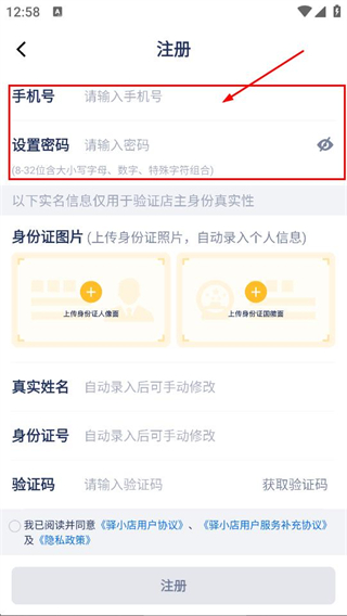 2、随后可以在驿小店注册页面,输入手机号,设置密码。