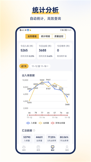 自动记录每日出入库数据,生成可视化运营报表,快递员通过微信扫码即可建立合作,托收费线上结算,佣金实时到账,财务管理透明便捷,助力驿站精细化运营。