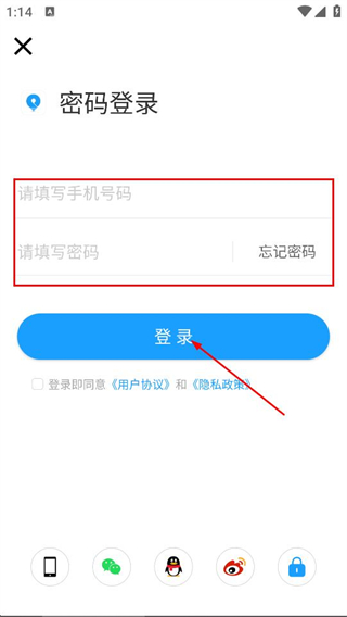 3、在密码登录页面,输入手机号码和密码,点击登录完成账号登录。