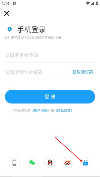 2、在手机登录页面,点击底部的密码登录图标,进入密码登录页面。