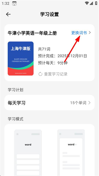 2、在学习设置页面,点击更换词书选项,进入选择词书页面。