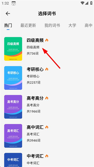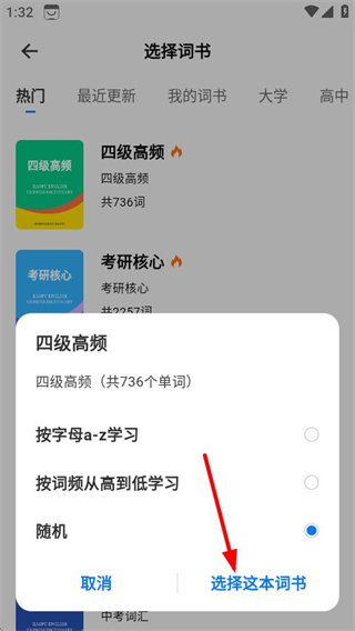 3、在选择词书页面,选择目标词书,弹出学习顺序选择弹窗。