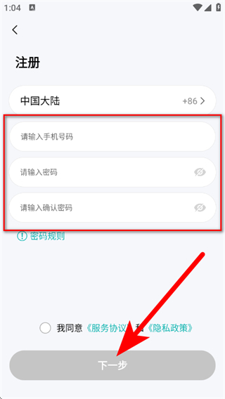 3、在注册页面,输入手机号码、设置密码,勾选后,点击下一步。