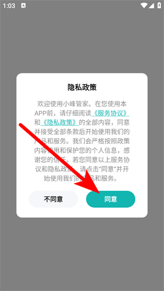 1、打开小峰管家,在隐私政策弹窗中,点击同意。