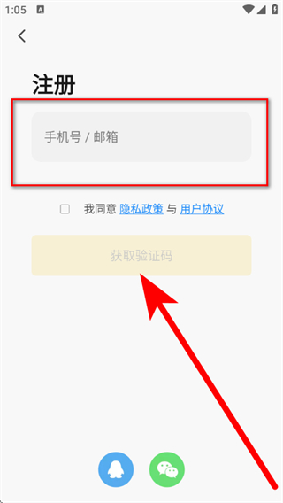 3、在注册页面,输入手机号邮箱,勾选后,点击获取验证码。