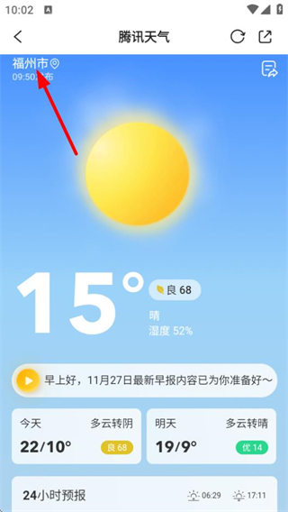 2、在腾讯天气页面,点击当前城市区域,进入选择城市页面。