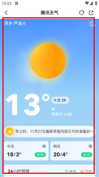 1、在今日芦溪首页,点击顶部的天气区域,进入腾讯天气页面。