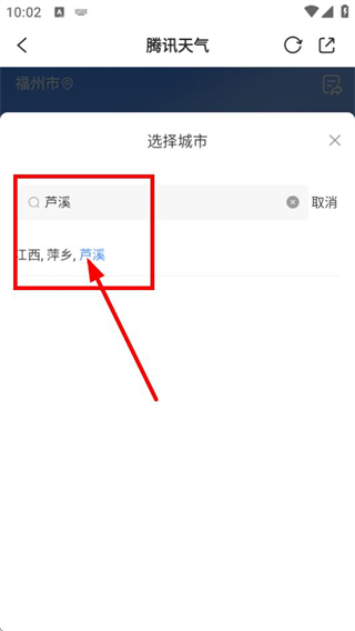 3、在选择城市页面,搜索并选择芦溪,切换至芦溪天气页面。