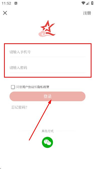 3、在登录页面填写手机号和密码,勾选协议后,点击登录按钮完成账号登录操作。