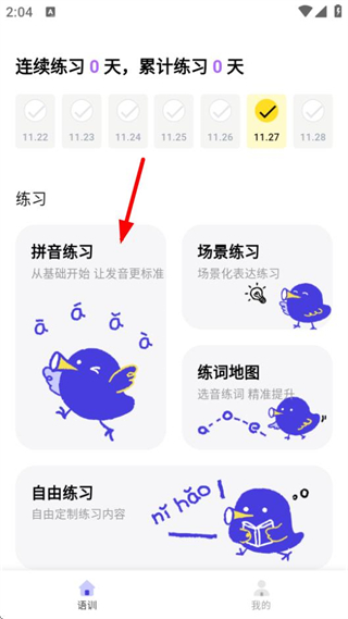 1、在雀说语训首页,点击拼音练习选项,进入拼音选择页面。
