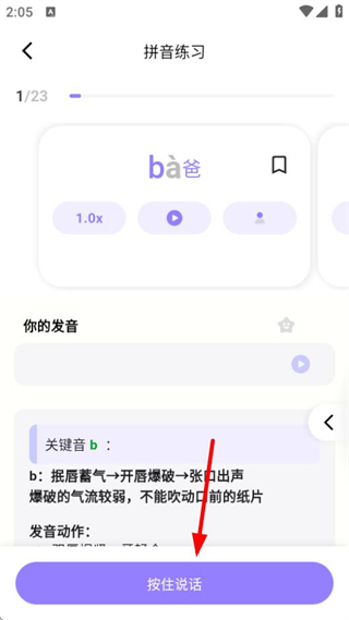 3、在拼音练习页面,查看发音指导后,点击按住说话按钮进行发音练习。