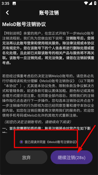 4、在注销协议页面,勾选协议后,点击继续注销完成账号注销流程。