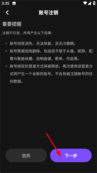 3、在重要提醒页面,点击下一步按钮,进入账号注销协议页面。