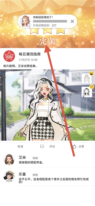 4、完成穿搭搭配后,即可获得完美评价及对应升级经验。