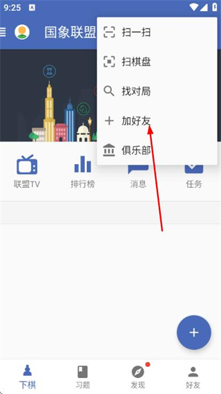 1、在国象联盟首页点击右上角的三点图标,打开功能菜单。