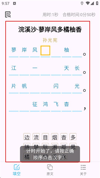 3、在练习页面,按照诗词原文顺序点击对应汉字,完成填空练习即可。