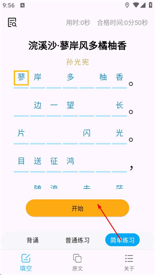 2、在简单练习模式下,点击开始按钮,进入诗词填空练习页面。
