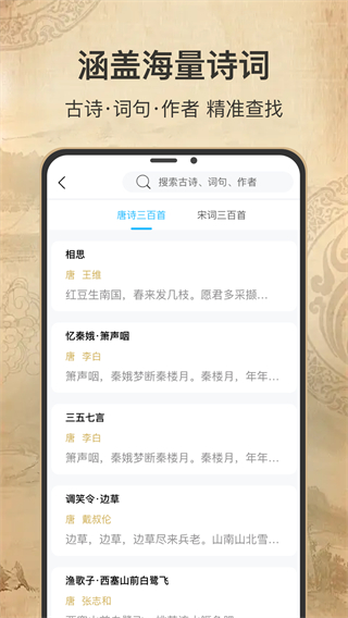 收录海量唐诗宋词经典篇目,涵盖不同朝代、流派的代表作品,按题材、作者、朝代分类整理,满足日常背诵、应试备考等多元学习需求,无需额外查找诗词素材。