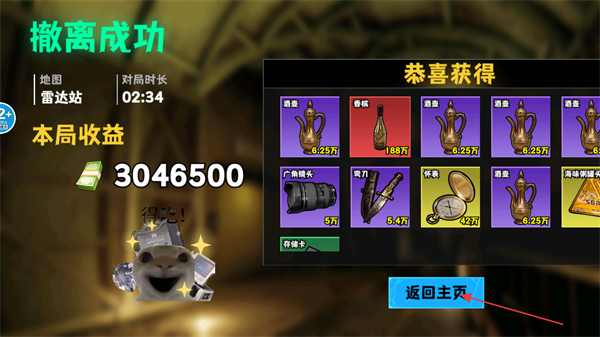 4、成功撤离后的结算界面可以查看本局收益和带出物品,点击返回主页按钮将物品放入仓库。