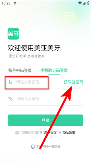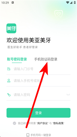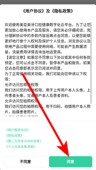 1、打开美亚美牙客户端,在弹窗中点击同意,进入登录页面。