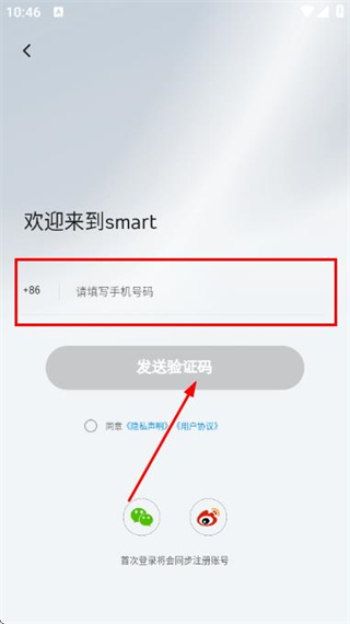 3、在手机验证登录页面填写手机号,勾选协议后,点击发送验证码。