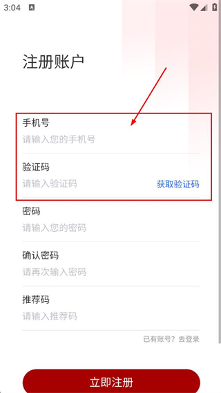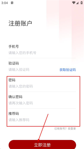 5、输入密码-确认密码及推荐码后,点击立即注册,完成账号注册操作。