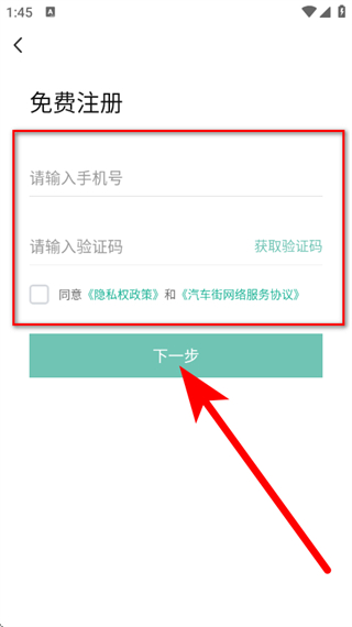 4、在免费注册页面,输入手机号,填入验证码并勾选协议后,点击下一步。