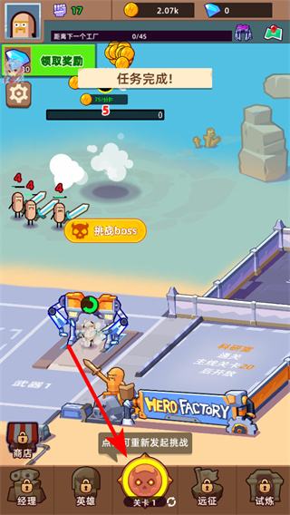 1、点击界面下方的关卡1按钮,可重新发起当前关卡的挑战,继续推进游戏进度。