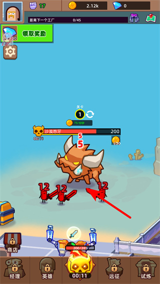 2、游戏中依照箭头指引,操控士兵部队攻击BOSS如沙漠牦牛,消耗其血量以完成关卡目标。