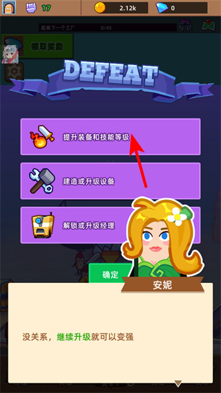 3、若挑战失败,点击提升装备和技能等级选项,强化养成系统增强士兵战力,为再次挑战做准备。