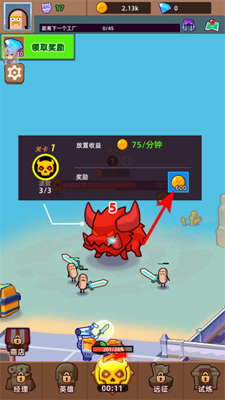 4、紧跟红色箭头指引,点击关卡界面的奖励图标,可领取当前关卡对应的奖励,积累资源用于养成。
